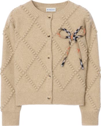 A crew-neck cardigan knitted from wool cashmere in a textured bobble knit. The style is detailed with a Burberry Check bow in signature sand beige.||Button closure|Rib-knit trims