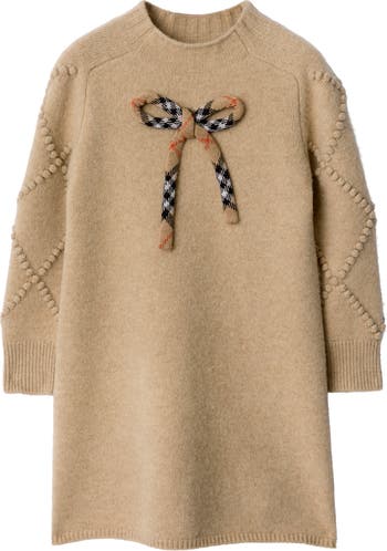 A long-sleeved dress in wool cashmere detailed with a textured bobble knit at the sleeves. The style is finished with a Burberry Check bow in signature sand beige.||Rib-knit trims