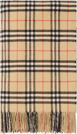A blanket in cashmere, woven with the Burberry Check in seasonal oxblood red. Made in Scotland at a mill founded in 1797, the fabric is washed in local spring water and brushed for an ultra-soft finish.||Rectangular|Fringing at both ends