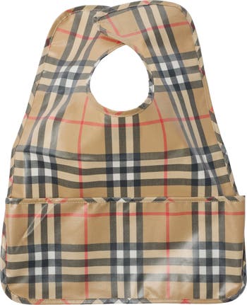 A baby bib in cotton woven with the Burberry Check in signature sand beige. The style has a wipe-clean coating and a pocket to catch spills.||Velcro-tab closure
