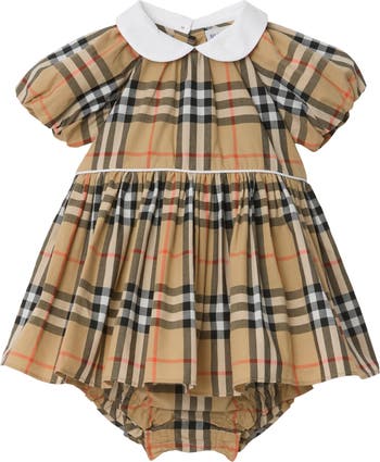 A short-sleeved dress in lightweight cotton woven with the Burberry Check in seasonal ice pink. The design is shaped with a gathered skirt and topped with a Peter Pan collar. Comes with matching bloomers.||Dress: back button closure|Bloomers: elasticated waist