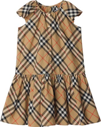 A dress in cotton poplin woven with the Burberry Check. The collarless style features cap sleeves and a gathered, flared skirt.||Front button closure