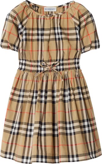 A dress in lightweight cotton woven with the Burberry Check in signature sand beige. The style is shaped with short puff sleeves and an elasticated gathered waist with a bow detail.||Front button closure|Side slip pockets