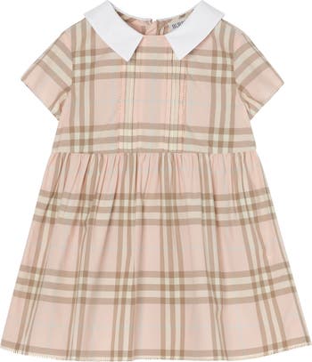 A cotton dress woven with the Burberry Check, featuring a pleated top and contrasting cotton poplin collar. The cap sleeves and gathered skirt are finished with intricate picot edging.||Back zip closure