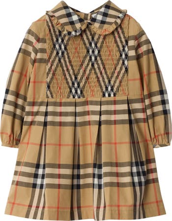 A long-sleeved dress in cotton poplin woven with the Burberry Check. The design features a pretty Peter Pan collar, smocked bodice and gathered skirt.||Back button closure|Single-button cuffs