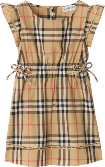 A dress in lightweight cotton, woven with the Burberry Check in signature sand beige. The style is detailed with decorative stitching and bows.||Back button closure|Side slip pockets
