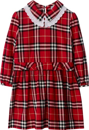 A long-sleeved dress in lightweight cotton flannel, woven with the Burberry Check in a seasonal poppy red colourway. The design features a gathered skirt and a Peter Pan collar trimmed with decorative lace.||Back button and side zip closure|Button cuffs