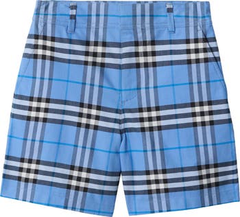 A pair of shorts made from soft cotton Oxford, woven with the Burberry Check in a seasonal cornflower blue colourway.||Age 3: hook closure|Ages 4-14: hook and zip closure|Interior waist adjusters|Side slip pockets, back welt pocket