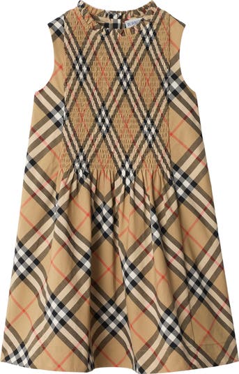 A sleeveless dress made from cotton poplin woven with the Burberry Check. The style features a gathered skirt and smocked bodice with delicate frills at the collar.||Back button and side zip closure|Cotton voile lining
