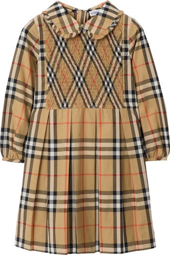A long-sleeved dress in cotton poplin woven with the Burberry Check. The design features a pretty Peter Pan collar, smocked bodice and gathered skirt.||Back button closure|Single-button cuffs