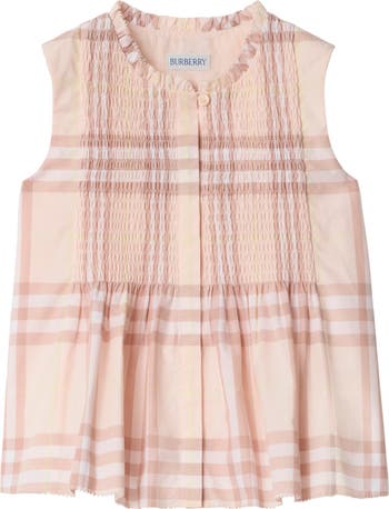 A sleeveless top in cotton poplin. The smocked style is woven with the Burberry Check and finished with intricate picot edging.||Front button closure|Cotton voile lining