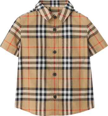 A short-sleeved shirt in cotton woven with the Burberry Check, topped with a neat point collar.||Button closure|Point collar|Chest patch pocket|Curved hem