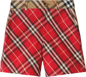 A pair of shorts made from soft cotton, woven with the Burberry Check in our seasonal crayon red colourway. The design is detailed with a contrasting waistband in signature sand beige.||Age 3: hook closure|Ages 4-14: hook and zip closure|Interior waist adjusters|Side slip pockets, back welt pocket