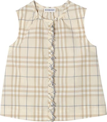 A sleeveless cotton top woven with the Burberry Check in seasonal sesame beige. The front-button closure is embroidered with Burberry lettering.