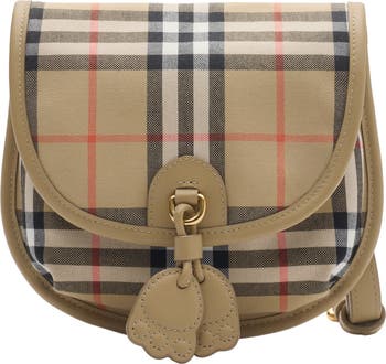A compact satchel bag in cotton canvas woven with the Burberry Check. The front flap features a D-ring with leather charms moulded to resemble paws, inspired by our signature mascot Thomas Bear. An adjustable crossbody strap allows for a comfortable fit.||Adjustable leather strap|Foldover flap with magnetic closure|Brushed metal hardware|Cotton lining|Comes with a dust bag