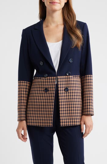 Double-breasted buttons create a tailored silhouette on this dark-wash denim jacket contrasted with polished checks.