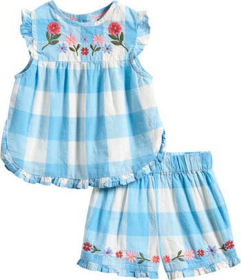 Colorful floral embroidery keeps baby looking fresh in this matching cotton set featuring playful ruffle trim and sweet checks.