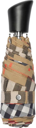 A folding umbrella made from nylon woven with the Burberry Check. The style is finished with a wooden handle and metal cap engraved with the Equestrian Knight Design. Part of Burberry Classics, wardrobe foundations with a unique Burberry slant.||Press-stud closure|Comes with coordinating zip pouch