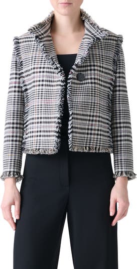 Neutral-hued classical plaid patterning resolves into soft fringe tracing every edge and seam on this cropped jacket tailored in a boxy silhouette.
