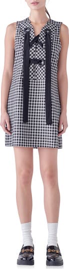 Oversized grommets and a laced-up front enliven this sleeveless shift covered in polished checks.