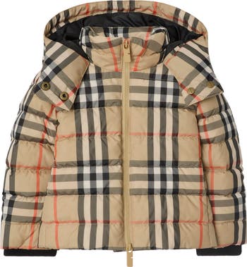 A puffer jacket in Burberry Check, filled with goose down and feathers. The hooded design features B-cut zip pulls and protective storm cuffs.||Two-way zip closure|Side press-stud pockets|Storm cuffs