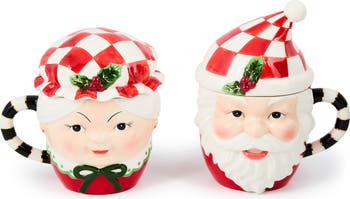 Mr. and Mrs. Claus invite you to enjoy your favorite hot holiday beverages from these festive mugs designed with kerchief and cap lids to help keep your drink warm into the long winter's night.
