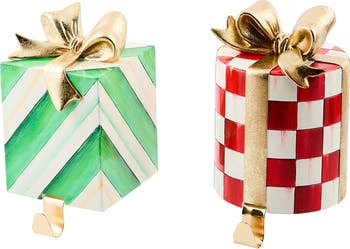 Add signature charm to your Christmas decor with these charming box figurines featuring red-check and green-stripe patterns, creating an eye-catching touch to your table or mantle.