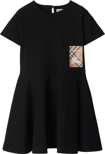 A short-sleeved dress in cotton jersey with a crew neck and flared skirt. Reworking the label from our signature trench coats, the style features an appliquéd patch woven with the Burberry Check, logo and Equestrian Knight Design. Part of Burberry Classics, wardrobe foundations with a unique Burberry slant. ||Back button closure|Appliquéd Burberry Check label at front