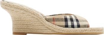 Espadrille mules made from stretch linen woven with the Burberry Check, lined in a matching material. The style is set on a wedge heel with a lightweight rubber sole embossed with our Equestrian Knight Design.||Almond-shaped toe|Quilted Burberry Check lining|Equestrian Knight Design at sole|Comes with a dust bag