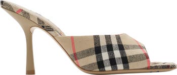 Sandals made in Italy from stretch linen woven with the Burberry Check, set on a high stiletto heel wrapped in leather. The quilted insole is padded for comfort and the sole is embossed with our Equestrian Knight Design.||Almond-shaped toe|Quilted insole|Stiletto heel|Equestrian Knight Design at sole|Comes with a dust bag