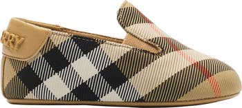 A pair of lightweight slip-on booties made in Italy from a nylon blend with a hint of stretch. The design is woven with the Burberry Check in signature sand beige and finished with a tonal logo at the heel.||Rounded toe|Raised Burberry lettering at heel