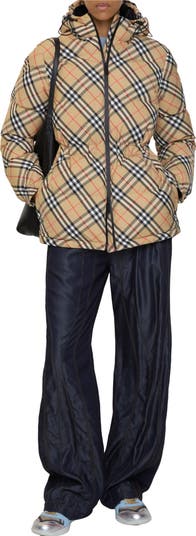 A hooded puffer jacket in our Burberry Check. Cut to a regular fit, the design features a drawcord waist to adjust the silhouette and is finished with B-cut zip pulls and the Knight stamp – an archival motif first seen on Burberry bags in the 1980s.||Two-way zip closure|Drawcord hood and waist|Side zip pockets; interior zip pocket|Elasticated cuffs|Silicone patch with Equestrian Knight Design at sleeve|Comes with a garment bag