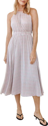A charming check print brings timeless appeal to this midi halter dress styled with a clean crew neckline and a back cutout. The blouson bodice gathers into an elastic waist for flattering shape, while the full, swingy skirt adds playful movement.