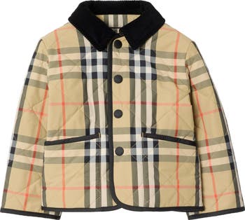 A quilted jacket in nylon woven with the Burberry Check and topped with a corduroy collar.||Press-stud closure|Side patch pockets
