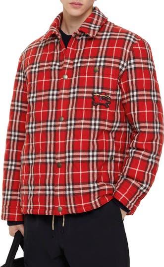A quilted jacket in wool flannel, woven with the Burberry Check in vibrant crayon red. Created as part of our Year of the Horse capsule, the appliquéd Equestrian Knight Design playfully reimagines our house code in textural and metallic threads.||Press-stud closure|Point collar|Chest press-stud patch pocket, side press-stud welt pockets|Press-stud cuffs|Appliquéd Equestrian Knight Design at chest|Comes with a garment bag