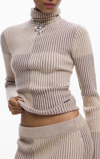 Intriguing ribbed checks in warm neutral hues alternate on this trim fine-gauge turtleneck sweater.
