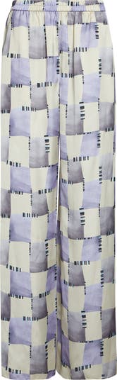 An allover check pattern adds eye-catching style to these wide-leg pants, while the soft satin fabrication offers a smooth, lustrous look that easily transitions from day to evening.