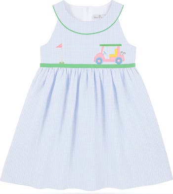 Classic and playful, this dress is crafted from blue and white check seersucker in soft, breathable 100% cotton—perfect for warm-weather days. A cheerful appliqué golf cart adds a sporty touch, while green spaghetti cording and back waist ties bring a pop of color and a charming finish. Designed in a timeless waist dress silhouette with a softly shirred skirt, it offers easy movement and comfort. A back zipper keeps dressing simple, and the knee-length hem makes it ideal for sunny outings, resort dinners, and picture-perfect vacation moments.