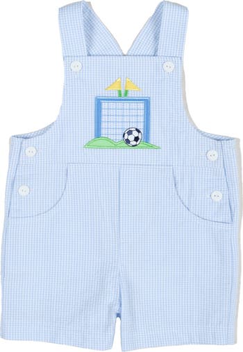 A playful favorite for little athletes, this blue-and-white check seersucker shortall features an adorable soccer goal appliqué, adjustable button straps, functional inseam snaps, side waist buttons, and charming fake fly detail.