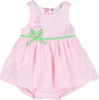 This charming skirted romper in pink check seersucker combines ease with sweetness, detailed with flower appliqués, spaghetti waist trim, an adorable back neck bow, and a concealed zipper for seamless comfort.