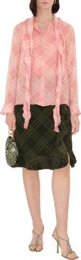 A wrap skirt made in Italy from silk, printed with a watercolour-effect Burberry Check. The style is edged with soft ruffles and features adjustable side ties with metal shields at the tips – a nod to our Equestrian Knight Design.||Side button and tie closure|Silk crepe de chine lining