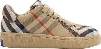 Sneakers in cotton woven with the Burberry Check. The mesh-lined style features wide check laces and the soles are moulded with archive Burberry lettering.||Lace-up closure|Burberry lettering at sole