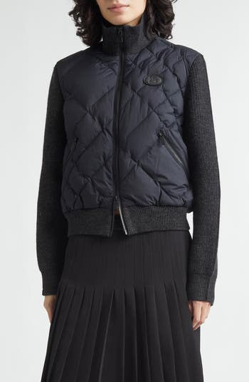 This hybrid jacket combines the lightweight, insulating warmth of a down vest with the cozy comfort of a sweater with knit sleeves and trim. The lightweight, water-resistant nylon core is quilted in a stitch inspired by the iconic Burberry Check, while an Equestrian Knight Design leather patch adds another element of signature branding.