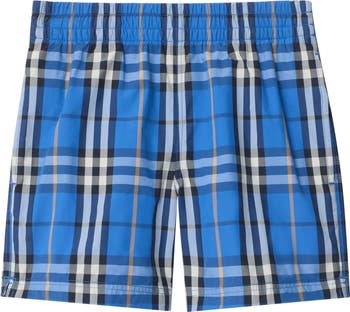 A pair of swim shorts made from nylon with a partial mesh lining. The design is woven with the Burberry Check in seasonal hyacinth blue.||Elasticated waist|Side slip pockets, back Velcro-tab patch pocket