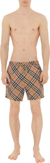 Drawcord swim shorts in nylon, woven with the Burberry Check. The style is cut to a relaxed fit and lined in mesh. Part of Burberry Classics, wardrobe foundations with a unique Burberry slant.||Elasticated drawcord waist|Side slip pockets, back press-stud pocket|Mesh lining