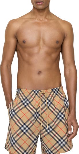 Drawcord swim shorts in nylon, woven with the Burberry Check. The style is cut to a relaxed fit and lined in mesh. Part of Burberry Classics, wardrobe foundations with a unique Burberry slant.