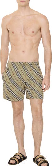 Drawcord swim shorts woven with the Burberry Check in a seasonal glade green. The style is cut to a regular fit and lined in mesh.