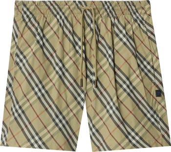 Drawcord swim shorts woven with the Burberry Check in a seasonal glade green. The style is cut to a regular fit and lined in mesh.||Elasticated drawcord waist|Side slip pockets, back press-stud welt pocket