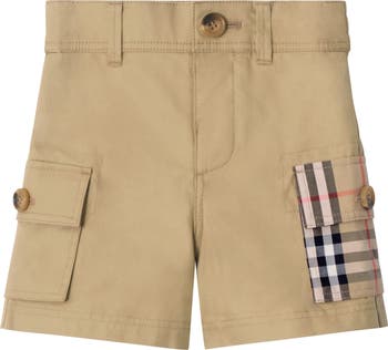 Cargo shorts in cotton twill featuring a Burberry Check pocket woven with our signature sand beige. An elasticated waistband at the back ensures a comfortable fit.||Button closure|Back elasticated waist|Side slip pockets, side button flap pockets