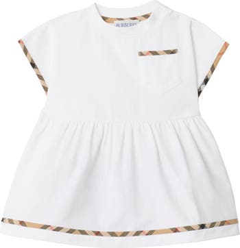 A short-sleeved dress in cotton jersey. The design is edged with Burberry Check trims in signature sand beige and comes with matching bloomers.||Dress: press-stud shoulder, chest patch pocket|Bloomers: elasticated waist